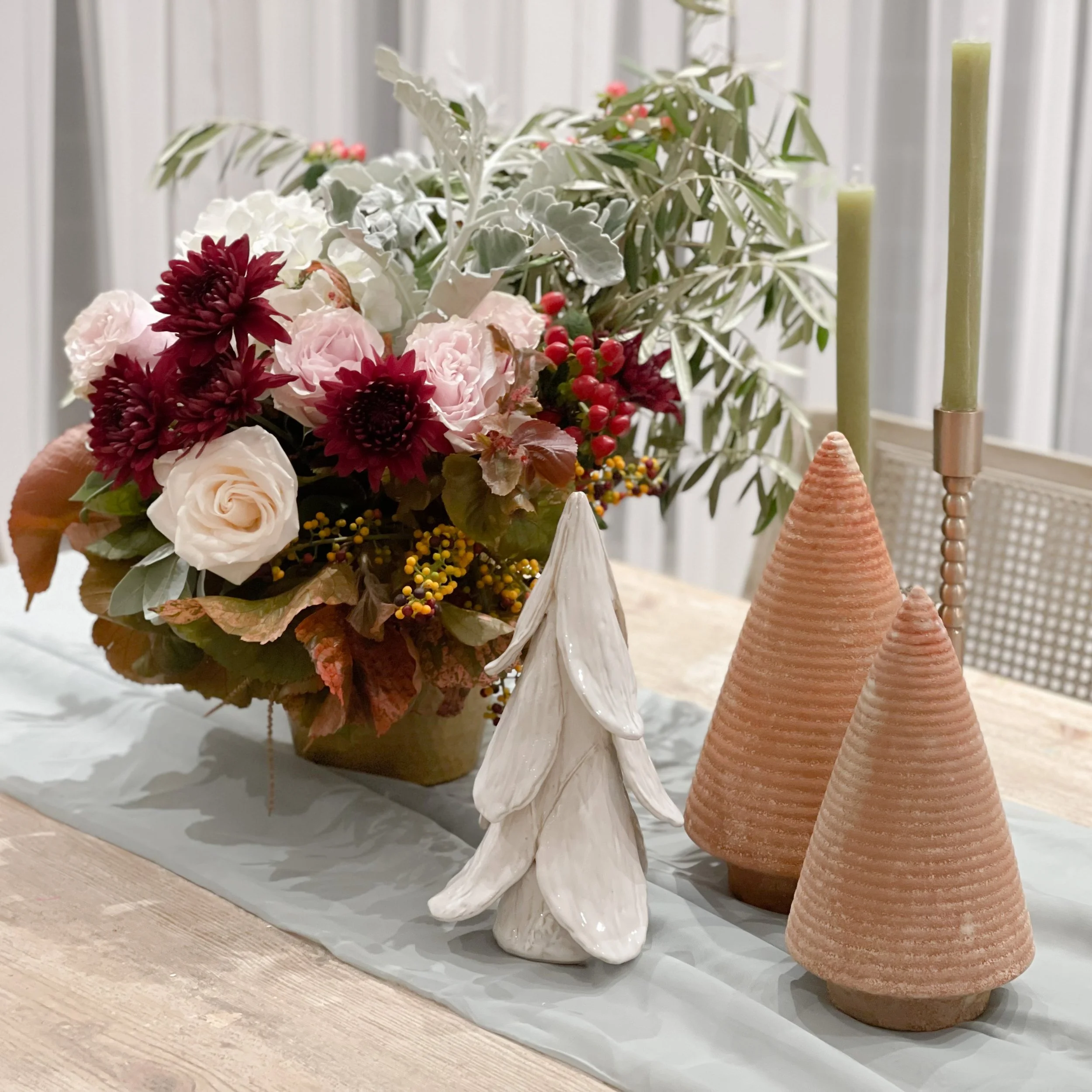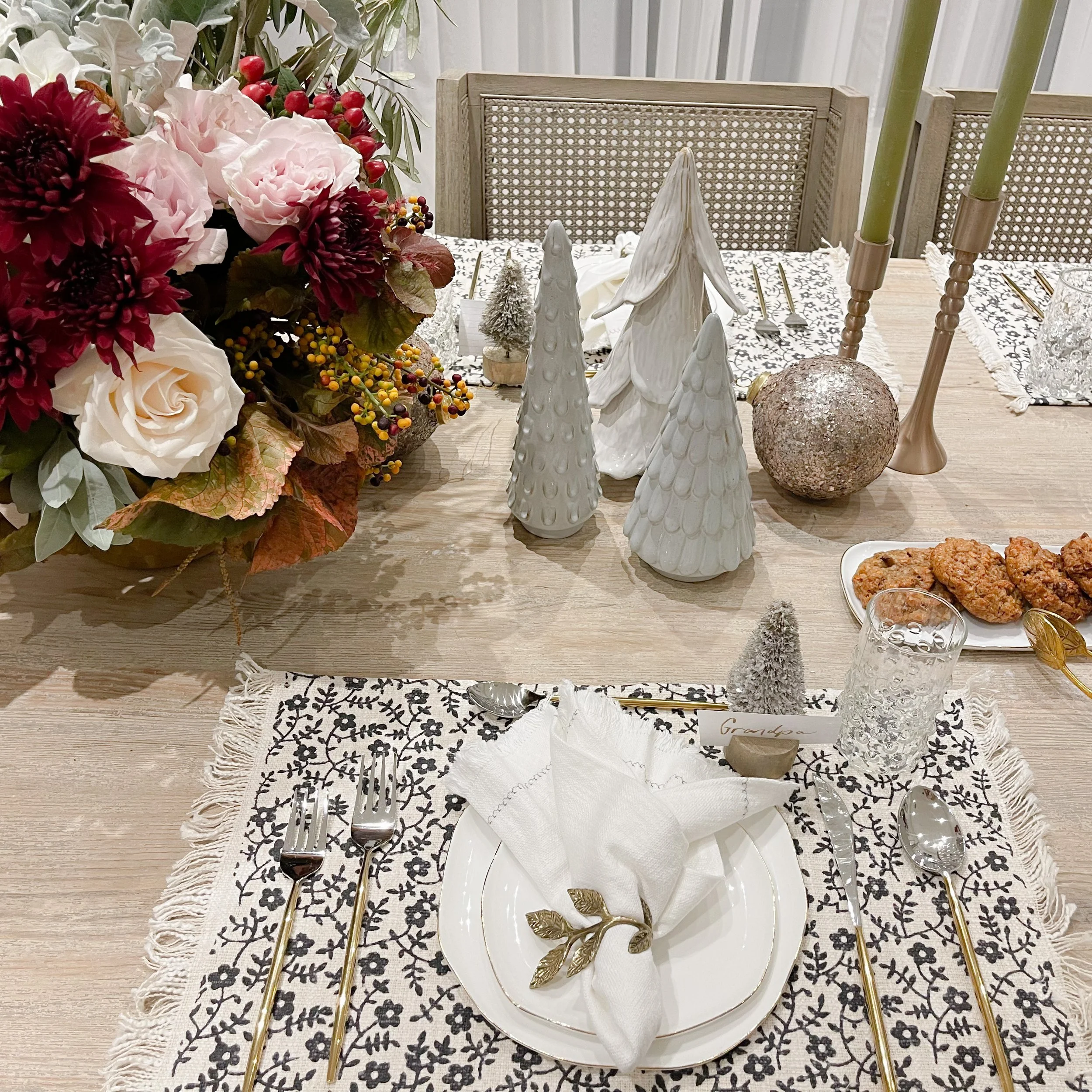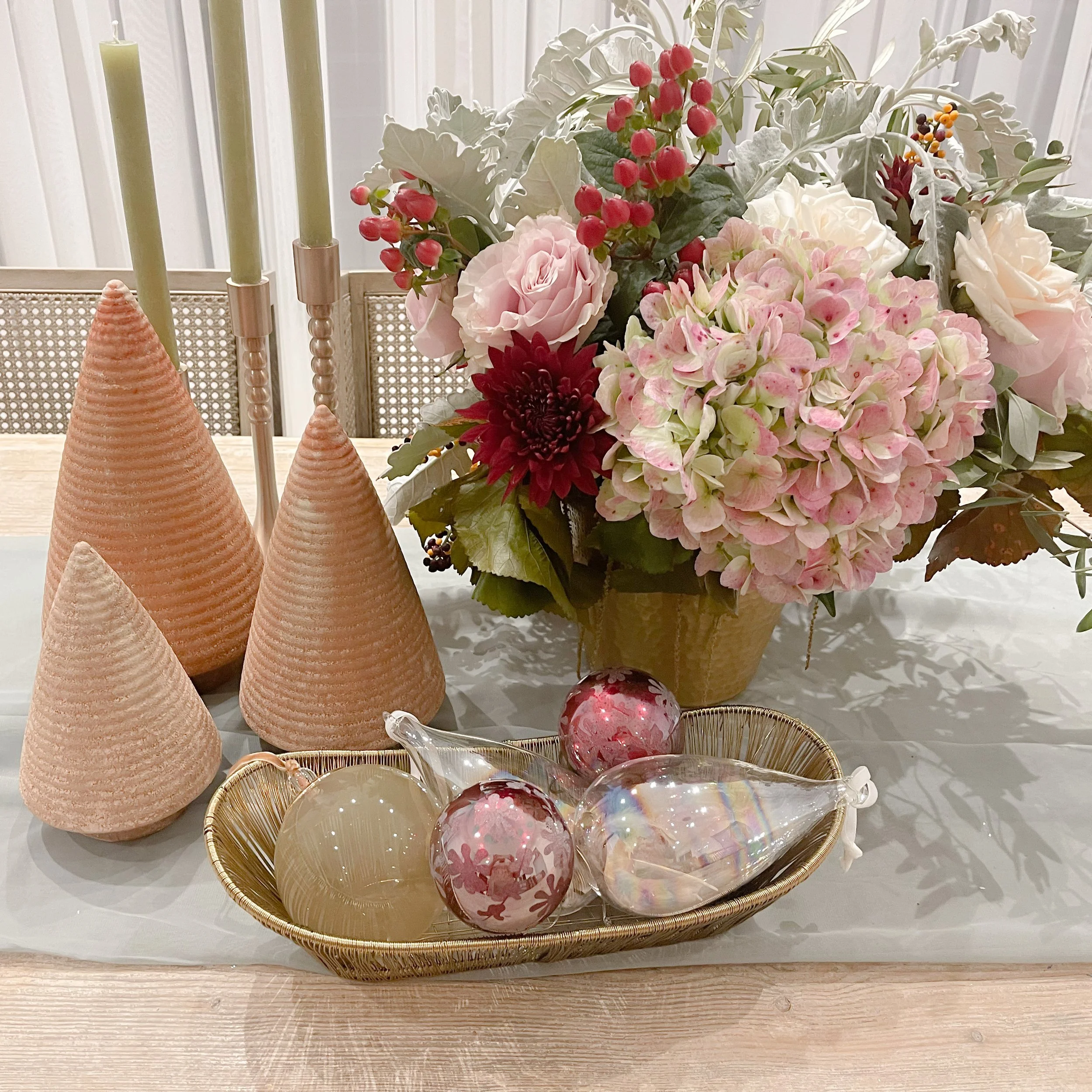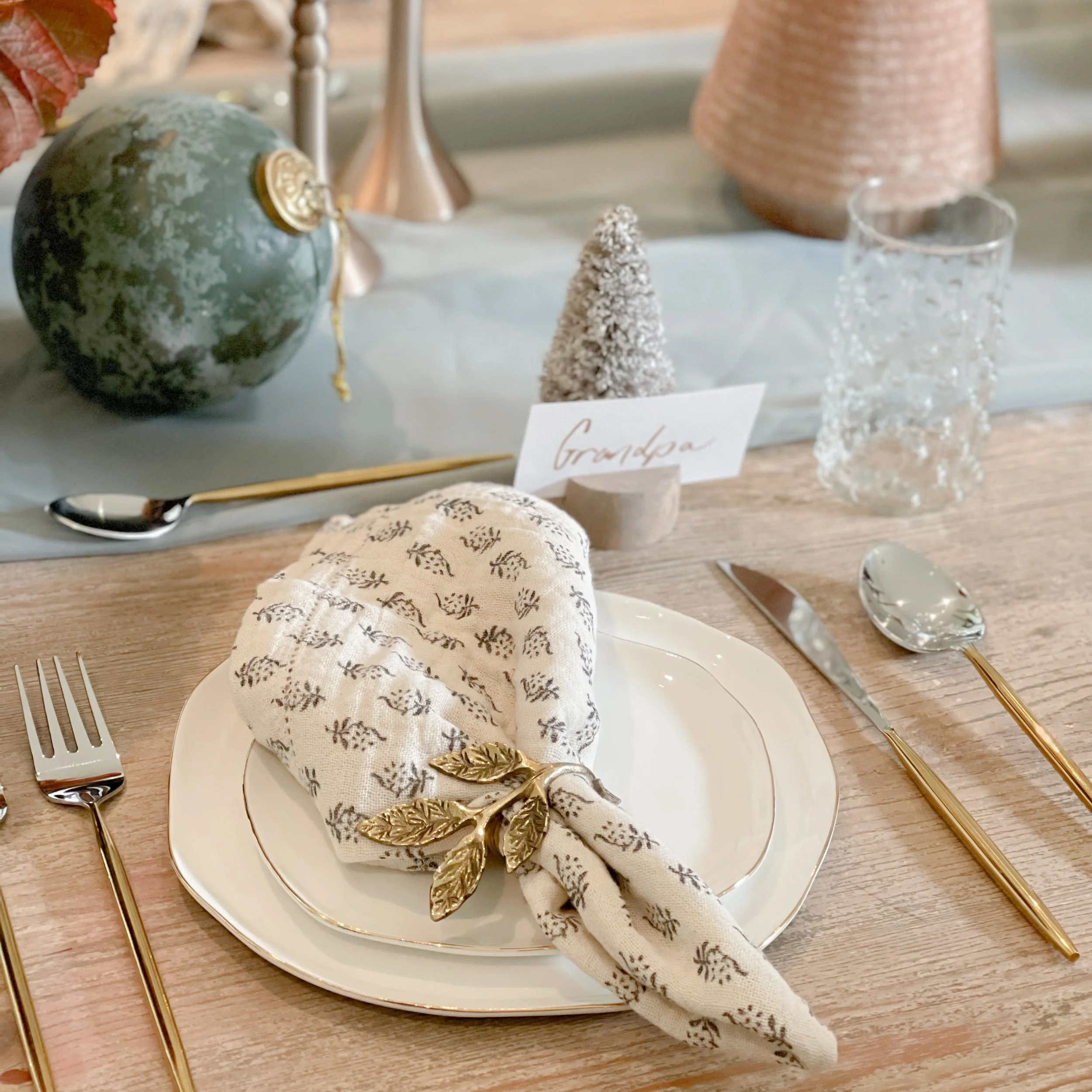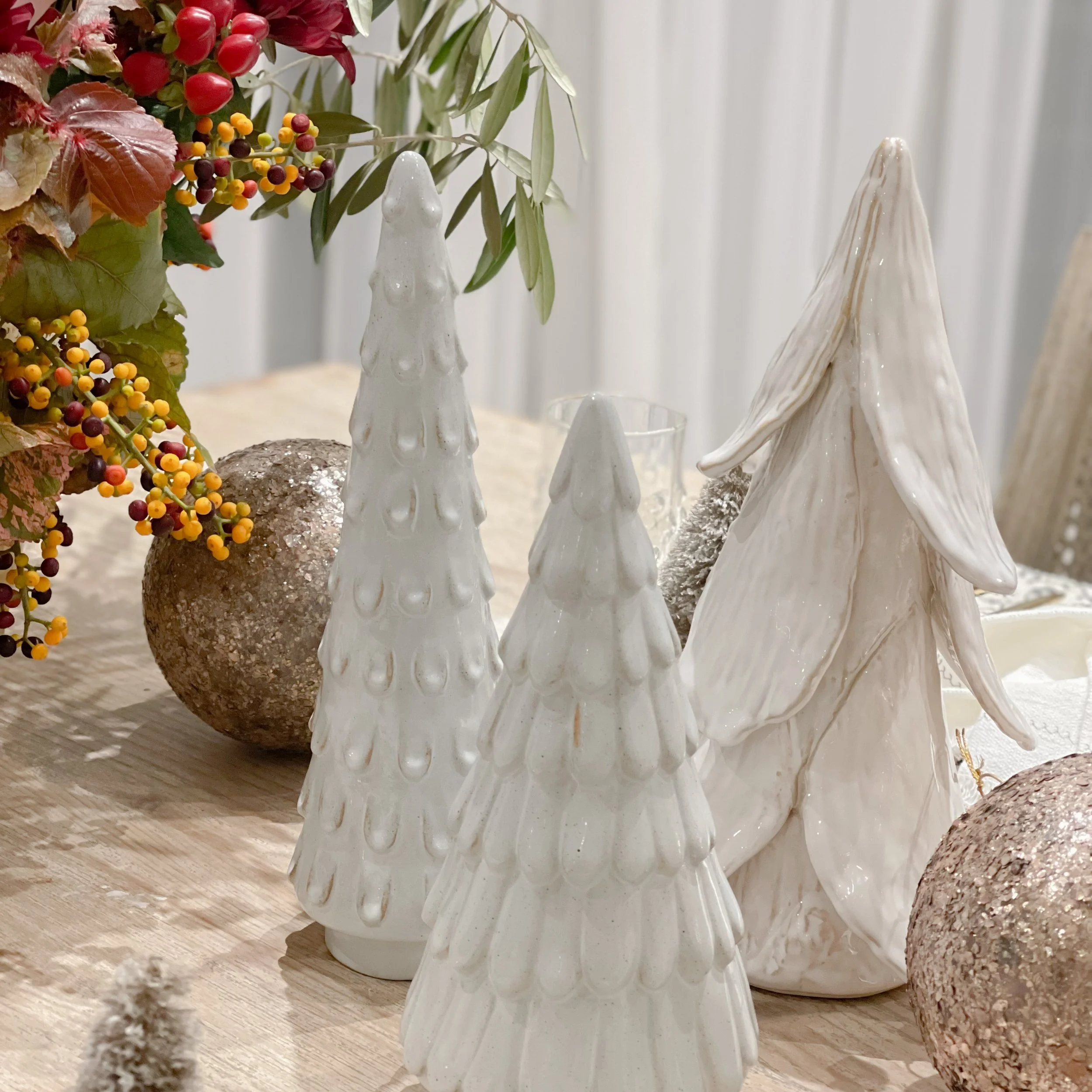 Holiday Bottle Brush Tree Cardholders, Set of 6 $33.00 Golden Leaves Napkin Ring, Set of 4 $32.00 Napkins with Printed Floral Pattern, Set of 4 $40.00 Hand-Forged Metal Taper Holder from $22.50 Sold out Unscented Taper Candles, Powder Finish, Set of 12 $54.00 Sold out White Stoneware Tree with Glaze $18.00 White Stoneware Tree with Glaze $22.00 Distressed Stoneware Tree with Moss Finish from $22.00 Hand-Made Stoneware Tree from $50.00 Sold out Glass Ball Ornament with Mika Flakes $15.00 Sold out Glass Ball Ornament with Rose Petals $12.00 Glass Small Ball Ornament with Clear Bead $12.00 Sold out Etched Mercury Glass Ball Ornament $9.00 Pearlized Glass Teardrop Ornament with Feather $12.00 Sold out Flocked Glass Ball Ornament with Verdigris Finish $16.00 Cotton and Velvet Floral Stocking $32.00 Sold out Faux Pine Wreath with Eucalyptus and Birch Balls $78.00 Wreath- Tea Leaf $34.50 Faux Flocked Berry Pick $11.00