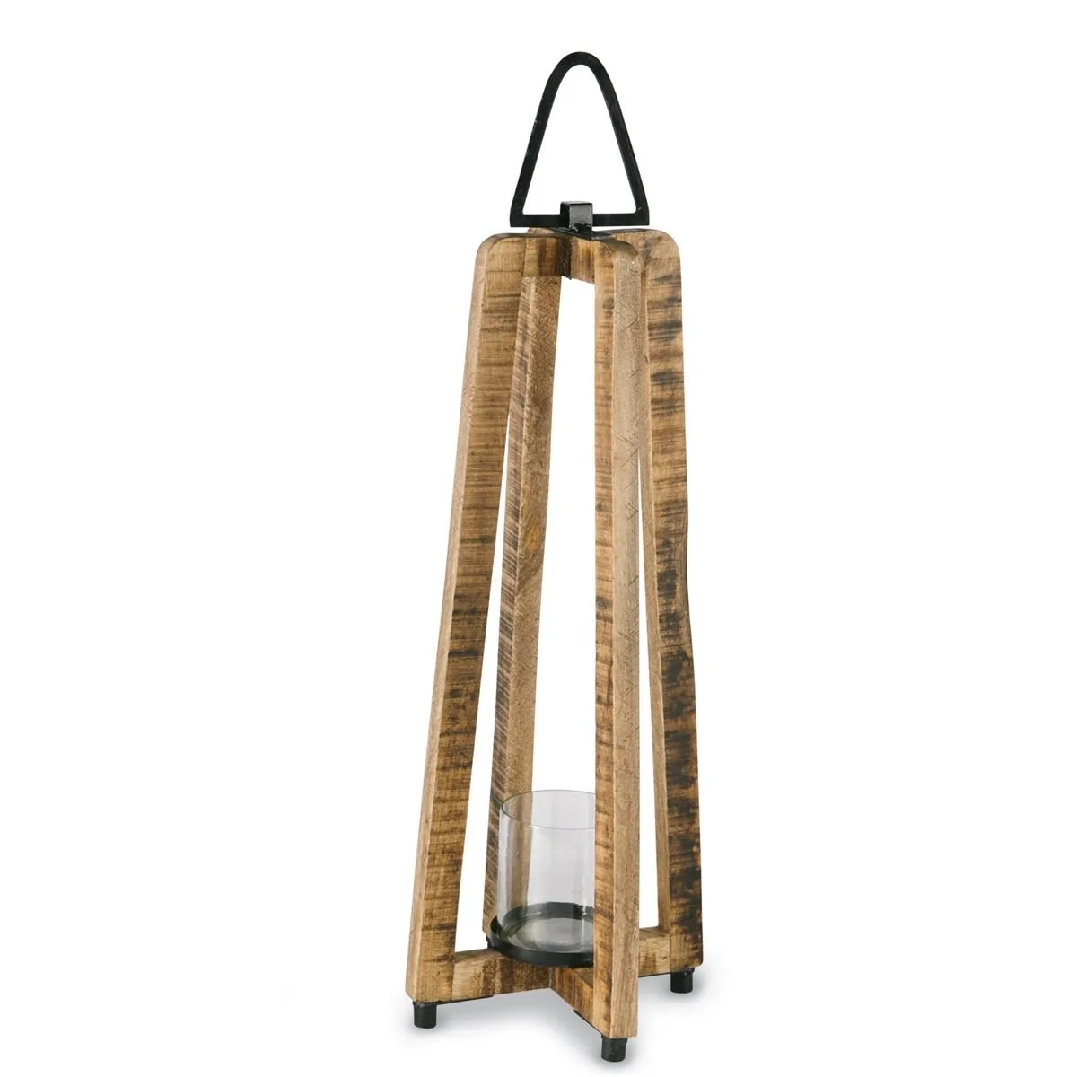 We couldn't love this on trend mango wood open air lantern more, featuring a cast iron top handle and tin place to hold a removable center glass hurricane. Candles are not included.